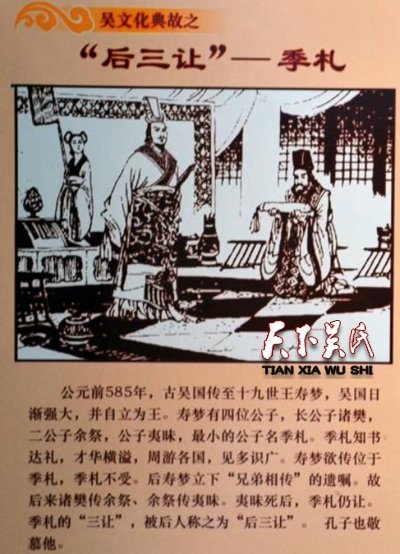 数代之后,吴国仲雍的后代传到寿梦,他继承了吴国王位。在寿梦的4个儿子当中,以四子季札最有德行,所以寿梦一直有意要传位给季札。