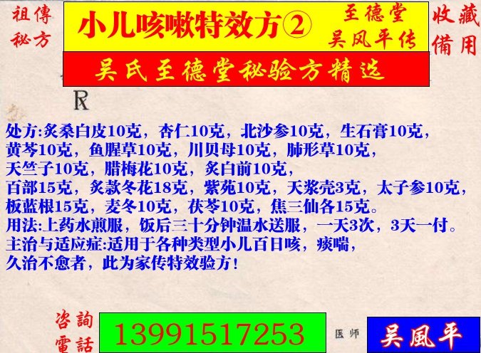 主治与适应症:适用于各种类型小儿百日咳,痰喘,久治不愈者,此为家传特效验方!