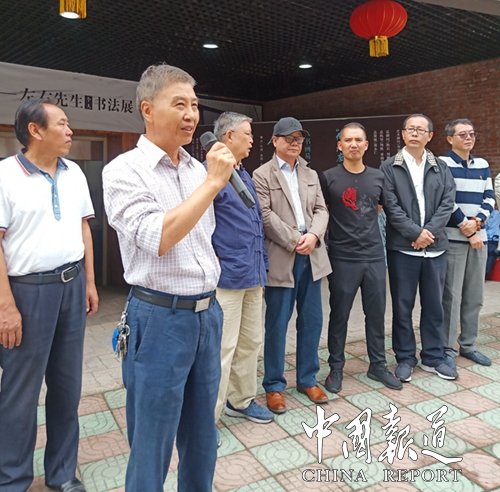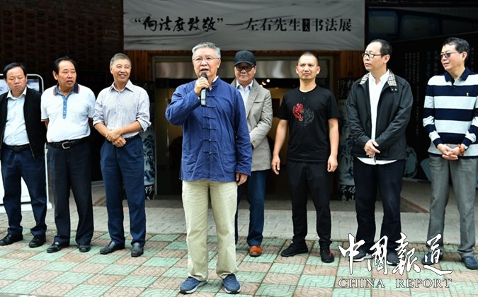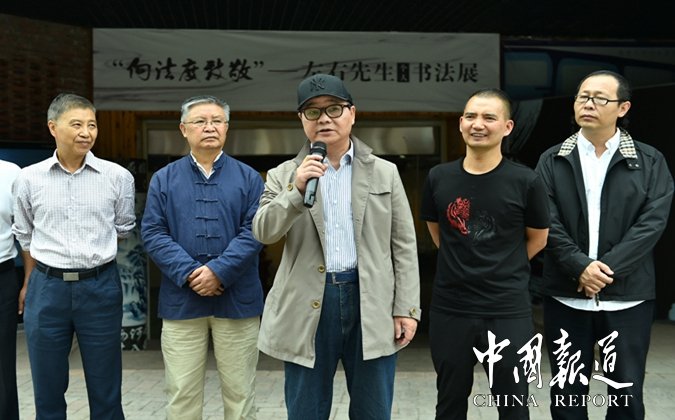 在开展仪式上,知名画家陈石多次对左右先生赞赏有加,中国小楷泰斗、书法大家刘惠浦是左右先生的恩师,他对弟子的进步和主张也表现出了难得的肯定和欣慰;知名书法家、画家、省书协顾问、贵阳市原副市长黑卫平也对左右先生的法度与创新给予高度赞赏。他们认为,左右先生以过硬的基本功和长期对中国书坛的观察、思考与实践为基准,大胆尝试“书法表现之传统与创新的平衡点”,创作并展出了近期的100余幅书法精品。