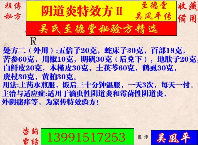 主治与适应症:适用于滴虫性阴道炎和霉菌性阴道炎,外阴瘙痒等。为家传特效验方!