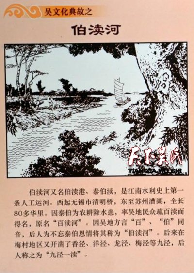 泰伯、仲雍两兄来梅里,从江南是一片水乡泽地开始,通过与当地土人一起数年的奋斗,把江南一大片区域改造成了能耕种二季水稻包括小麦一类粮食的肥沃土地,成功的开凿了江南历史上第一条"人工运河",先民们为颂扬泰伯的功德,把这条河渠命名为"泰伯渎"。