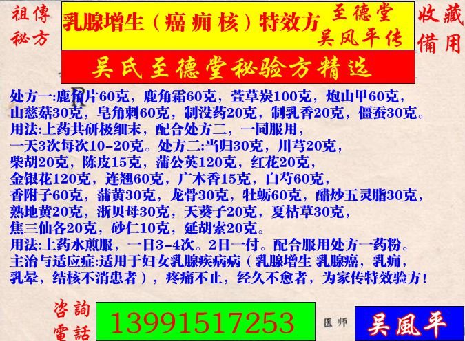 主治与适应症:适用于妇女乳腺疾病病(乳腺增生,乳腺癌,乳痈,乳晕,结核不消患者),疼痛不止,经久不愈者,为家传特效验方!