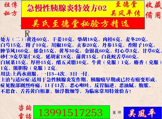 主治与适应症:适用于急性胰腺炎发作期,胰腺癌早期或已经有癌变形成。症见腹部剧烈疼痛,口干口苦,恶心呕吐,反胃膈逆,恶油腻,腹胀,不思食,舌苔黄白相兼,脉浮数细等,为临床常用特效验方!