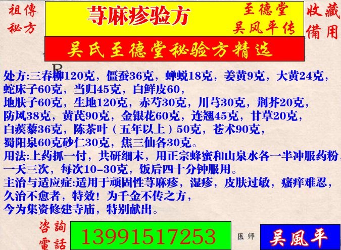 主治与适应症:适用于顽固性荨麻疹,湿疹,皮肤过敏,瘙痒难忍,久治不愈者,特效!为千金不传之方,今为集资修建寺庙,特别献出。