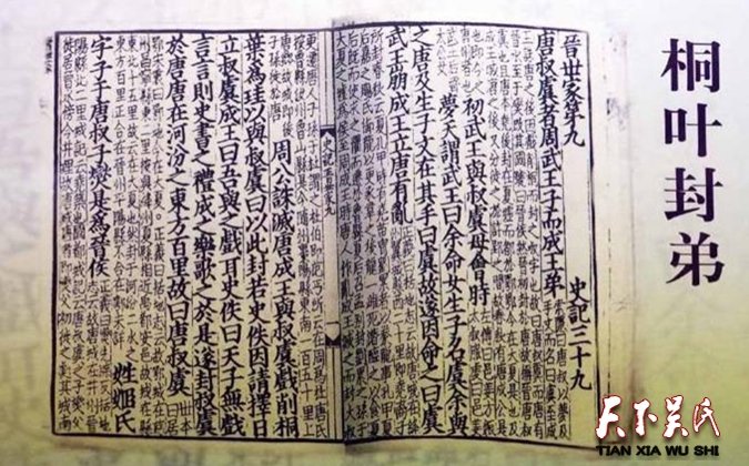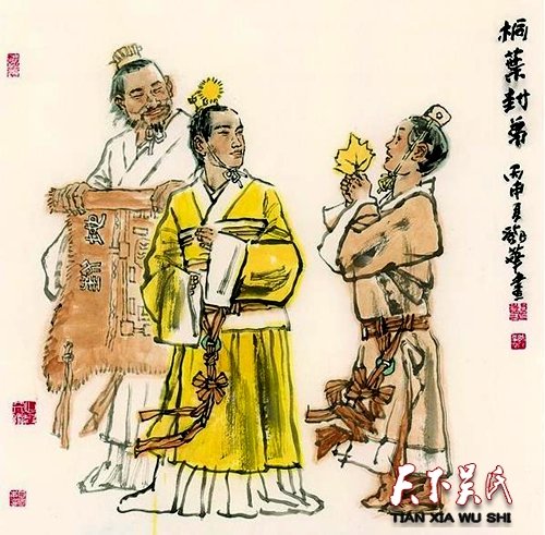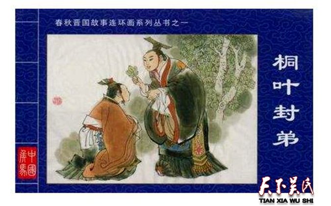 “桐叶封弟”又可称作“剪叶”封弟,出自于《吕氏春秋》。这个典故与周公旦有关。周公旦为周朝的开国功臣,他是周文王的儿子,周武王的四弟,周成王的叔父。周成王即位时,年龄非常小,只有13岁,难以亲自处理朝政大事,所以由武王临终时托付的辅佐重臣周公代理朝政。周公忠心耿耿,充分发挥了自己的才干,把国家治理得很好,还为周王朝制定了一整套典章制度,对后世影响很大。西周初年的一天,年幼的成王姬诵和弟弟叔虞一起在宫中玩耍。玩得高兴时,姬诵随手捡起了一片落在地上的桐叶,把它剪成玉圭形,送给了叔虞(yú),还笑着对弟弟说:“这个玉圭是我送给你的,我要封你到唐国去做诸侯。”史官们听后,把这件事告诉了周公。周公见到姬诵,问道:“你要分封叔虞吗?”姬诵说:“怎么会呢?那是我跟弟弟说着玩的。”周公却认真地说:“天子口中无戏言。你既然说出口了,就要这么去做。”成王听罢,觉得有道理,只好选择吉日,把叔虞正式封为唐国的诸侯,史称唐叔虞。不过,这叔虞也很争气,长大后励精图治,以自己的智慧才能,带领百姓兴修水利,改良农田,大力发展农业,使唐国百姓逐渐过上了安居乐业的生活,深受爱戴。据史书记载,当时还出现了“异亩同颖(yǐng 禾的末端)”的祥兆,据说当时麦谷丰收在望,不同的田亩里长出特别丰满肥硕的麦穗,称做“嘉禾”。叔虞将嘉禾进献周天子成王,成王命叔虞再将它献给远在东土的周公,周公还特意为之作《馈(kuì赠送)禾》与《嘉禾》。唐叔虞死后,他的儿子燮(xiè)继位。因为境内有晋水,便改国号为“晋”。山西简称晋,也由此而来。同时为了祭奠唐叔虞,百姓们还在晋水源头、悬瓮(wèng)山下修建了一座祠堂来祀奉他,这就是“晋祠”。“天子口中无戏言”这句话也因此流传开来。“桐叶封弟”的典故告诉我们:当权者应言而有信、谨言慎行,万万不可信口开河。