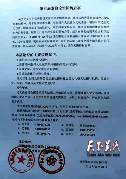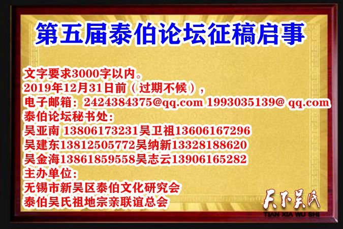 吴文化是中华优秀传统文化的重要组成部分,其核心内容是泰伯精神。而弘扬泰伯精神,对于延续中华文脉,全面提升人民群众文化素养,增加中华民族文化自信,增强国家文化的软实力,维护国家文化安全,推进国家治理体系和治理能力的科学化、现代化,提升我吴氏的影响力等,都具有重要的现实意义和深远的历史意义。自2014年10月12日在祖地无锡泰伯庙召开首届《泰伯论坛》以来,已举办四届,现经泰伯论坛理事会、泰伯论坛秘书处及全国各地吴氏宗亲代表商量,第五届泰伯论坛将于2020年4月11日在无锡梅村召开。