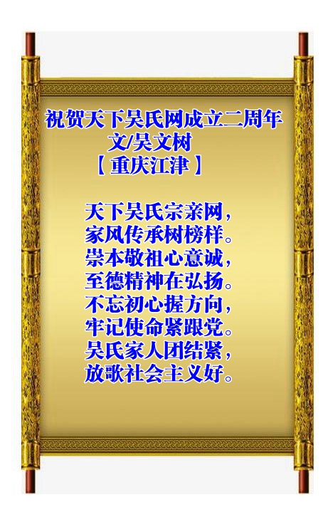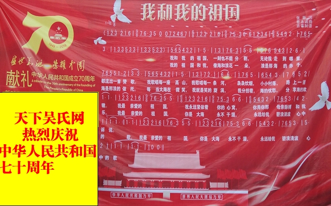 天下吴氏网二周年,正逢祖国70华诞。可喜可贺!值此,祝 愿“天下吴氏网”继续坚持以弘扬社会主义核心价值观,传播中华优秀传统文化为使命。传承吴氏文化、引领至德精神为目的方向。紧跟新时代步伐,矢志不渝地前行。为天下吴氏,共同唱响对伟大祖国的时代颂歌!