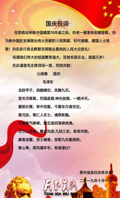 金秋十月,时逢国庆,七十周年,举国同欢,国泰民安,繁荣富强。天下吴氏,吴氏官网,二零壹七,国庆上线,幸之运之,名扬天下。我们秉承,至德精神,弘吴文化,传正能量,吴氏宗亲,鼎力支持前往各地,宗亲组织,现场采访,现场报道,金冠集团,泉海集团,顺心保洁,至德圣道,世界至德,华夏吴氏,中华吴氏,贵州荷花,广西吴氏,广东吴氏,贵州吴氏,江西吴氏,江苏无锡吴氏祖地,海南吴氏,陕西吴氏,云南吴氏,安徽吴氏,河南吴氏,山西吴氏,辽宁吴氏,河北吴氏,上海吴氏,福建吴氏,浙江吴氏,湖南吴氏,湖北吴氏,四川吴氏,甘肃吴氏,香港吴氏,台湾吴氏,海外吴氏,山东吴氏,内蒙吴氏,新疆吴氏,宁夏吴氏,吉林吴氏,奥门吴氏。