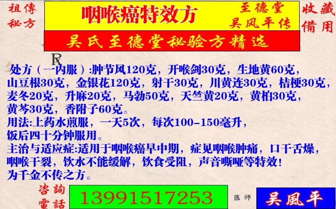 主治与适应症:适用于咽喉癌早中期,症见咽喉肿痛,口干舌燥,咽喉干裂,饮水不能缓解,饮食受阻,声音嘶哑等特效!为千金不传之方。