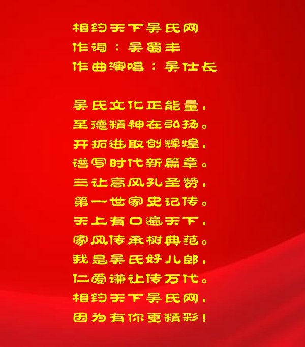 吴氏家族自古以来就是华夏民族大家庭的重要一员。值此新中国诞生七十周年之际,祝天下吴氏继承泰伯遗风,弘扬吴氏家风,不忘初心,牢记使命,为实现中国梦贡献一份宝贵的力量!(重庆知名作家 吴长龄)