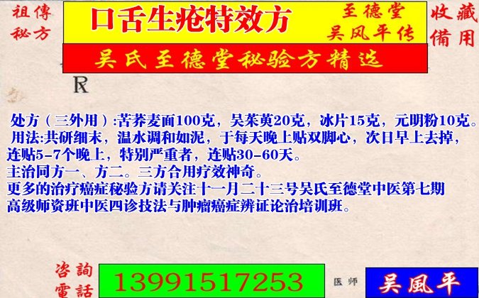 主治与适应症:适用于口舌生疮,赤烂疼痛难忍,口腔癌,舌癌早中期,症见口舌口腔糜烂肿痛,口干舌燥,咽喉干裂,不能饮食,声音嘶哑等特效!为千金不传之方。