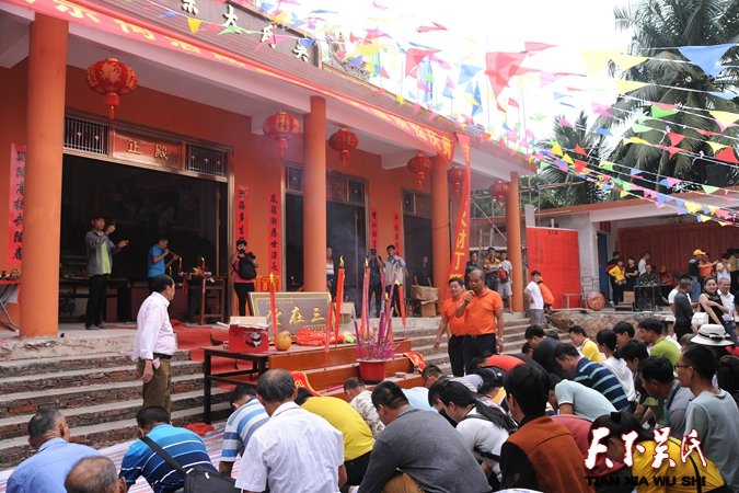 天下吴氏网讯(吴乾山海南报道)2019年11月14日,上午暖阳煦照,椰风习习,万泉河衅,中风村,礼炮三响,“吴氏大宗祠”改建殿莹回火安座仪式开始:重请师圣,挥笔点主,先祖灯坛,趙楼旺相,逾火扬威,舞狮驱邪,升殿安座,谢师关圣,福归主人,进香奉祀等祭祖法事有序进行。琼海市吴贤秀文化艺术舞师队表演“龙腾虎跃,狮舞蛇飞”精彩纷呈。