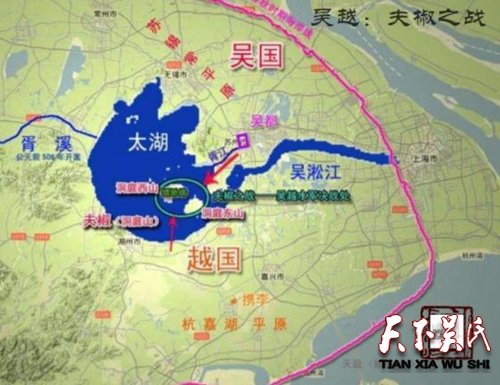 吴王夫差之国运纵横经过几年奋发图强,吳国稳固了国基并且有了一定的实力。越王勾践惶惶不可终日,决定对吳国先下手为强。公元前494年春天,勾践调三万精兵从水路进攻吳国,吳王夫差命伍子胥为主将,率军队在夫椒迎战,即今天的太湖马山、洞湖山一带。开战当天,夫差头晚上一晚未眠,脑子中满是三年前的故事,父亲阖闾在与越国军队激战的场面历历在目,犹如昨天发生的事一样一直塞满脑海,三年来一直是挥之不去的痛。父亲阖闾临终前的那种不舍、那种英雄壮志未酬的遗憾,那种对越国的仇恨,那满含期待的殷殷嘱咐,家国情仇在1095天的每时每刻贯穿在胸怀,一直激励自己。天还未明,夫差即起床,穿戴披甲,早早亲临前线,时辰一到,站在大鼓前,一捶下去,鼓声震天,由于激奋、激动,夫差一心想打败越国,俘虏勾践,以报父仇,以雪国耻,豪情之下用力过于勇猛以至于把战鼓擂破,鼓声震得山谷轰鸣,犹如天鼓激荡,响彻七十二峰,荡浊太湖波涛汹涌。越军被这震天响声吓得胆战心惊,晕头转向,军心大乱。吳军在吴王夫差带领下,号召将士为先王阖闾报仇,奋勇向前,士气大振,同仇敌忾,一举击溃越国军队,一路乘胜追击,越军溃不成军,望风而逃,夫差率领吴国军队势如破竹,一路攻城掠地,越国大部分城池被拿下,最后占领了越国首都会稽城(今浙江绍兴),包围越国首都会稽山,迫使越国臣服于吳国,这就是历史上著名的夫椒之战。