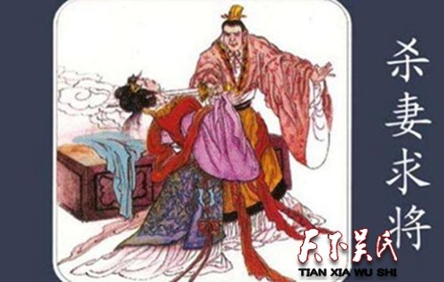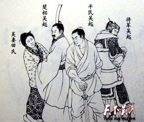 吴起休妻 吴起让他妻子织一条丝带,结果长度比他要求的短了一些。吴起让她去改一下,他妻子答应了。等到织好了又量了量,还是不符合吴起的要求。吴起非常生气,他妻子回答说:“我开始织的时候就把线定好了,不能再改了。”吴起于是休掉了妻子。吴起的妻子向她哥哥求助,她哥哥说:“吴起是制定法令的人,他制定法令,是想为大国建立功业。他的法令必须先要在自己的妻子身上兑现,然后才能推行下去,你不要指望再回去了。”吴起妻子的弟弟后来被卫国国君重用,想凭着自己的身份去求吴起与其姐复婚。吴起没有答应,反而离开了卫国。另一种说法:吴起把织好的丝带拿给他妻子看后让她织条一模一样的,等到丝带织成后一经比较,新织的那条特别好。吴起说:“让你织条丝带,要求像那条一样。这条织得特别好,是什么原因?”他妻子说;“用的材料是一样的,只是我多下了些工夫,所以织的更好。”吴起说:“这不是我的吩咐。”于是让妻子穿好衣服,把她休回了娘家。她的父亲前去求情,吴起说:“我在家从来不说空话。”