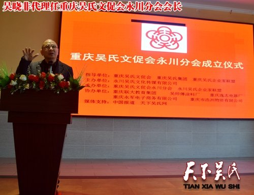 重庆吴氏文化发展促进会自11月2日召开筹备会以来至今,已达5000余名会员代表,丰都、奉节、南岸、秀山、云阳、永川、梁平等区县分会已经正式成立,其发展速度成为全国之最。目前,永川吴氏分会已有102名宗亲代表,重庆吴氏文促会永川分会的成立,让3万多永川吴氏宗亲终于有了一个温馨的家,一个幸福的港湾!我们坚信:重庆吴氏文促会永川分会,在重庆吴氏集团、重庆吴氏文促会、重庆吴氏企业家联盟领导下,永川3万余名吴氏宗亲,牢记“传播吴文化,弘扬至德精神为己任,联盟吴氏企业,惠泽吴氏宗亲,群策群力,奋力拼搏,努力将永川分会办成规范的协会,将永川吴氏公司办成一流的企业,将永川吴氏企业家联盟办成高效的平台!