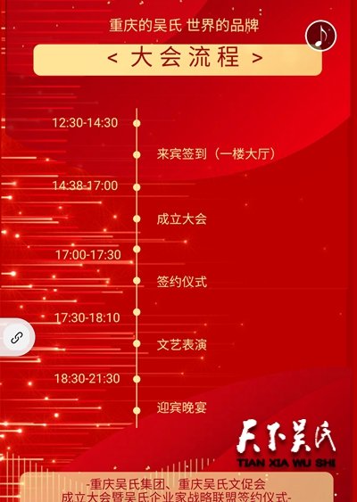 重庆吴氏集团、重庆吴氏文化发展促进会、重庆吴氏企业家联盟,邀请全球、国内及重庆市有关领导、中国知名品牌企业CEO、兄弟省市自治区的吴氏企业和协会主要领导、重庆吴氏文促会区县分会领导和吴氏宗亲代表,于2019年12月31日(星期六)下午14:38,在重庆创世纪酒店举办 “重庆吴氏集团、重庆吴氏文促会成立大会暨重庆吴氏企业家战略联盟签约仪式”。