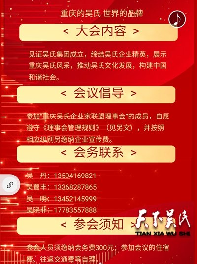 会议倡导参加“重庆吴氏企业家联盟理事会”的成员,自愿遵守《理事会管理规则》(见另文),并按照相应级别另缴纳企业宣传费。