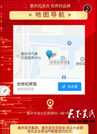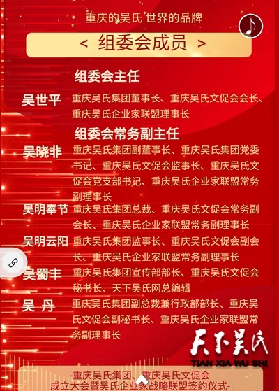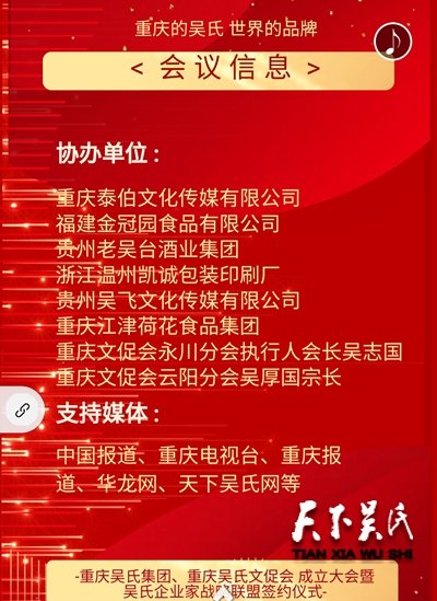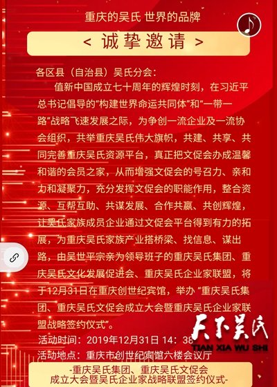 重庆吴氏集团、重庆吴氏文化发展促进会、重庆吴氏企业家联盟,邀请全球、国内及重庆市有关领导、中国知名品牌企业CEO、兄弟省市自治区的吴氏企业和协会主要领导、重庆吴氏文促会区县分会领导和吴氏宗亲代表,于2019年12月31日(星期六)下午14:38,在重庆创世纪酒店举办 “重庆吴氏集团、重庆吴氏文促会成立大会暨重庆吴氏企业家战略联盟签约仪式”。