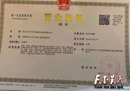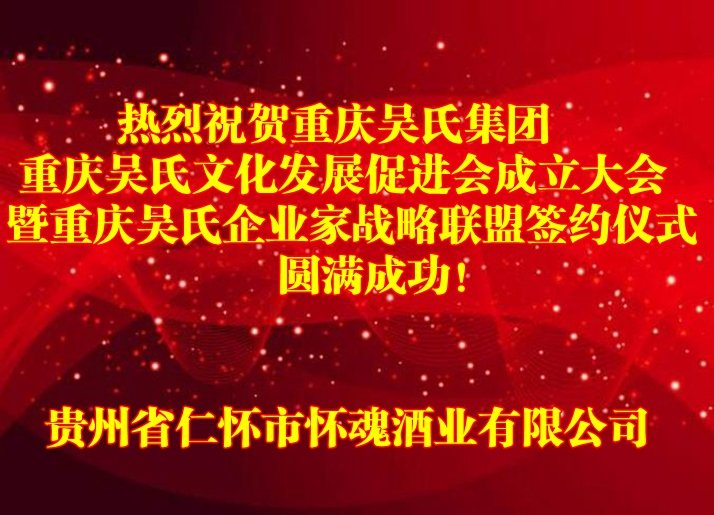 贵州省仁怀市怀魂酒业有限公司为重庆吴氏集团、重庆吴氏文化发展促进会成立大会暨重庆吴氏企业家战略联盟签约仪式赞助酱香型《吴帝骄子酒》8件。