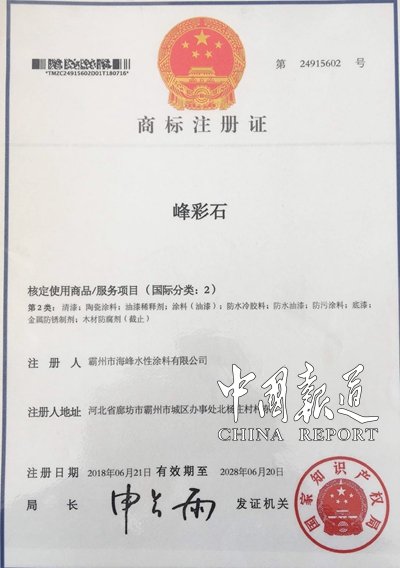 河北省霸州市海峰水性涂料有限公司峰彩石漆集团公司始创于1999年。公司已通过ISO9001、ISO14000、CNAS、UL等认证, 产品皆获得CCC、FDA认证, 为客户直接提供国际认可的权威性认证报告。公司本着以人为本,专注水漆的经营理念,为人民服务的宗旨,主要从事水性涂料的研发与生产,以及施工。产品包括水包水、水包砂、真石漆、质感漆、外墙乳胶漆等系列。产品遍布全国,在国内有7大生产基地。分别分布在,河北霸州、新疆喀什、陕西西安、湖北武汉、云南昆明、辽宁开原、湖南长沙。
