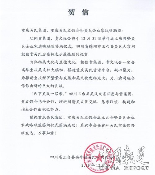 欣闻贵会于2019年12月31日举行重庆吴氏集团、重庆吴氏文促会成立大会暨重庆吴氏企业家战略联盟签约仪式。无锡市吴文化研究会、无锡吴氏祖地宗亲会特向你们致以热烈祝贺!