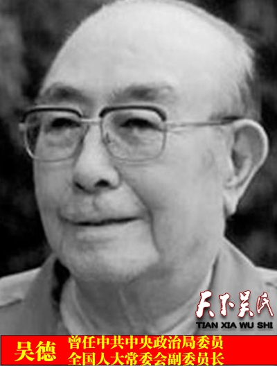 07吴德(1913年2月-1995年11月29日),河北丰润人。曾用名李若夫、李子实、孔四维。曾任中共中央政治局委员、全国人大常委会副委员长、全国人大常委会党组副书记,932年至1937年,在北平弘达中学学习时参加反帝大同盟,任全国总工会华北办事处驻唐山市工会特派员,唐山市工联党团书记,华北铁路总工会党团书记,中共北平市委副书记、职工部部长,华北铁路工委书记。抗日战争时期,1937年至1940年任中共河北省委组织部部长,冀热察区党委组织部部长兼冀东分委书记。1940年至1945年,在延安参加整风,任中共中央敌后城市工作委员会秘书长,中共中央情报部第四室副主任。解放战争时期,任中共冀热辽分局组织部部长,晋察冀边区政府交通局局长兼平绥铁路局局长、党委书记,中共晋察冀中央局秘书长,冀东区党委书记,冀东军区政治委员兼唐山市委书记。中华人民共和国成立后,1949年10月至1950年3月任燃料工业部副部长。