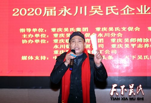 天下吴氏网讯(吴蜀丰)由重庆吴氏文化发展促进会永川分会主办,重庆联大教育集团、重庆吴师傅涂料集团、重庆浩洲物资公司、重庆吴平志养蜂农场、永川德鹏商贸公司、重庆群祥石油化工公司、重庆逸志电器厂等单位协办的“2020届永川吴氏企业家迎春年会”1月16日在重庆永川商贸城举行。