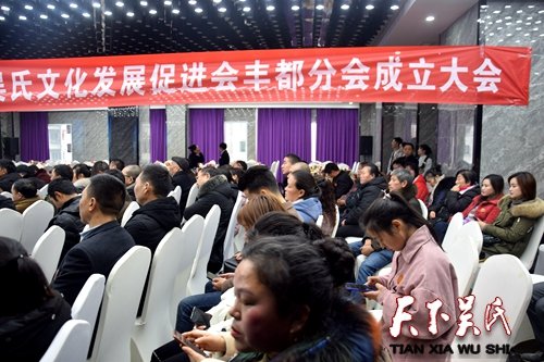 本次成立大会由重庆吴氏文化发展促进会丰都分会秘书长吴培荣主持,大会在全体起立歌唱国歌声中拉开序幕,集体观看重庆吴氏文化发展促进会宣传片,中国报道《魅力城乡》主编、天下吴氏网总编、重庆吴氏文化发展促进会发起人、秘书长吴蜀丰在会上讲解吴姓起源发展历史,从古公亶父周太王三子泰伯、仲雍、季历,到三让天下,泰伯奔吴,吴文化、至德精神与大家。并重点介绍了湖广填四川(重庆)有关吴姓入川的历史。