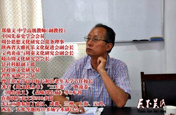 【作者简介】郑鼎文,大学文化,中学高级教师(副教授),中国先秦史学会会员,周公思想文化研究会常务理事,陕西省大雅礼乐文化促进会副会长,宝鸡炎帝与周秦文化研究会副会长,岐山周文化研究会会长,县社科联副主席,县政协文史研究员,省作家协会会员,曾任范家营高中校长和县老年大学首任校长,著有《周文化丛书》“三王卷”“典故卷”、《周公演义》《品味周公庙》等9本书,在报刊发表文章500多篇。先后应邀参加了武汉、成都、兰州、上海、宝鸡、西安、天水等地的30多场学术研讨会。