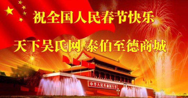 值此新春佳节之际,江西泰伯庙筹委员会全体人员向全世界吴氏宗亲拜年,天下吴氏一家亲,祝亲新年快乐!万事如意,身体健康,合家幸福,财源广进!天下吴氏一家亲,让我们弘扬致德精神,把三让高风,世家第一的吴文化代代相传,永放光芒。