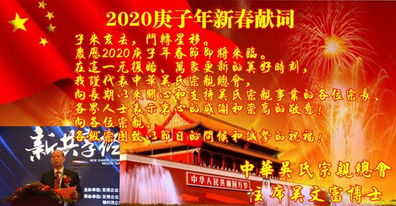 子来亥去,斗转星移。农历2020庚子年春节即将来临。在这一元复始、万象更新的美好时刻,我谨代表中华吴氏宗亲总会,向长期以来关心和支持吴氏宗亲事业的各位宗长、各界人士表示衷心的感谢和崇高的敬意!向各位宗亲、各级宗团致以节日的问候和诚挚的祝福!