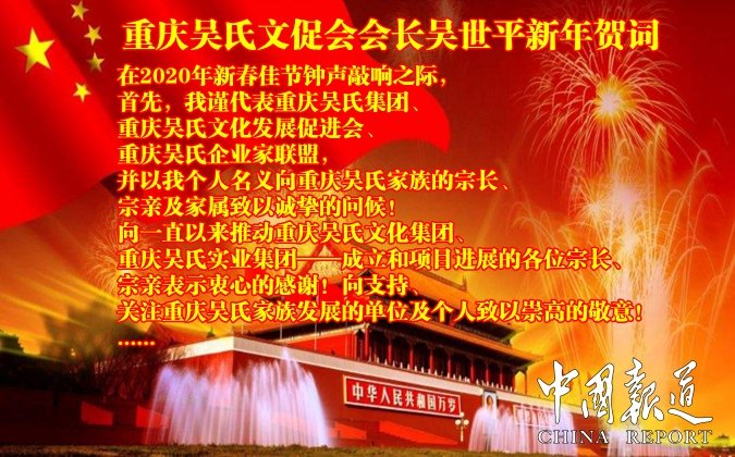 展望2020年,我们将积极推进与中国重庆——各部门的密切合作,最大限度地满足家族内部宗亲的需求,为重庆吴氏家族企业在中国的发展作岀更大的贡献。我坚信2020年就是练就重庆吴氏集团健硕的血肉之躯的一年,也是我们共同见证吴氏家族奇迹的一年。为实现重庆吴氏三百万工程(300万人)努力奋斗!新春佳节来临之际,世平祝愿重庆吴氏家族的明天更加美好,祝福大家在新的一年里,财源滚滚达三江、好运绵绵连四海!