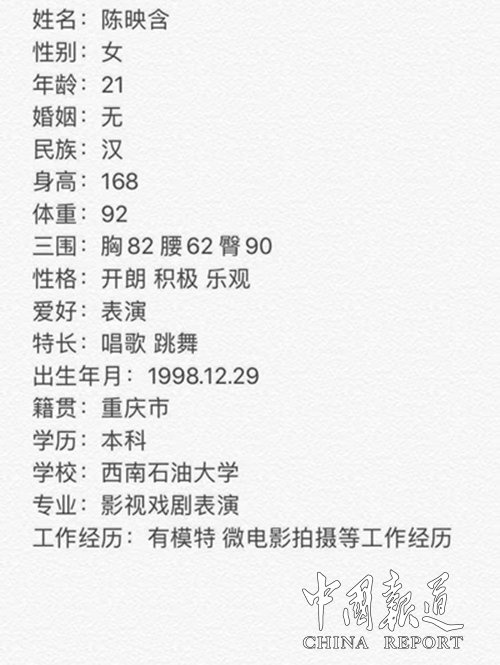 中国报道讯(吴蜀丰报道)陈映含,出生在中国神曲之乡三峡库区--丰都鬼城,就读于西南石油大学艺术学院影视戏剧表演系。业余时尝试接拍过多部微电影,上镜赏心悦目,入戏角色绝配,颇受观众喜爱。