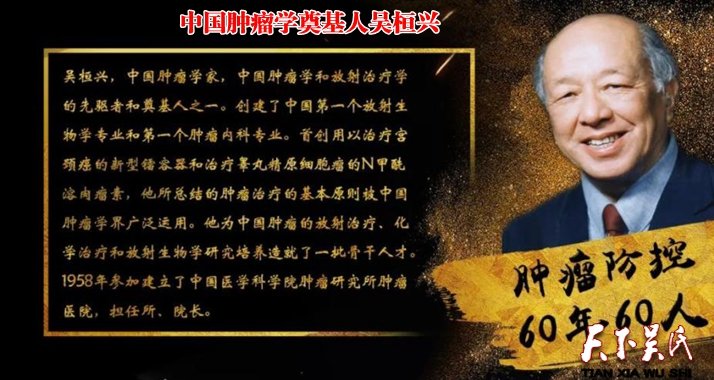 中国肿瘤学奠基人吴桓兴,祖籍广东梅县梅城大浪口人,1912年生于非洲毛里求斯路易斯港一个爱国华侨的富裕家庭。他的家族已在那里繁衍生息了100多年。少年时代的他亲身体验了海外华侨受到的不公正待遇和歧视。他发奋读书,立志长大为祖国争光。1929年吴桓兴以全校第二名的优异成绩毕业于毛里求斯皇家学院高中并通过英国剑桥大学的海外考试,免费进入剑桥大学预科。在剑桥大学快毕业时,他父亲鼓励他回中国学习。1931年吴桓兴从剑桥大学预科毕业后,只身回到中国在上海复旦大学攻读医科,1936年毕业,获医学博士学位。次年,赴欧深造,先后在比利时、英国、法国进修。1946年任英国伦敦大学附属医院放射科副主任,在肿瘤学医疗、研究方面取得优异成绩。英政府希望他能永留英国,但他以祖国医疗事业为重,毅然放弃良好的工作条件和优越的待遇,于是年底回归祖国,在沪创建我国肿瘤放射治疗机构,出任上海比镭锭医院院长。