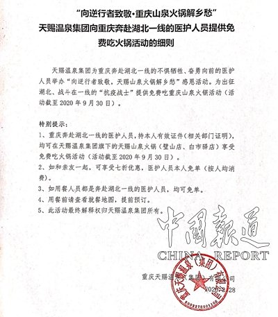 【特别提示】重庆奔赴湖北一线的医护人员,持本人有效证件(相关部门证明),均可在天赐温泉集团旗下的天赐山泉火锅(壁山店、白市驿店)享受免费吃火锅活动(活动截至2020年9月30日).如和亲友一起,可享受七折优惠,医护人员本人免单(按人均消费)。如用餐人员都是奔赴湖北一线的医护人员,均可免单。用餐前请查看就餐地图,提前预订。此活动最终解释权归天赐温泉集团所有。