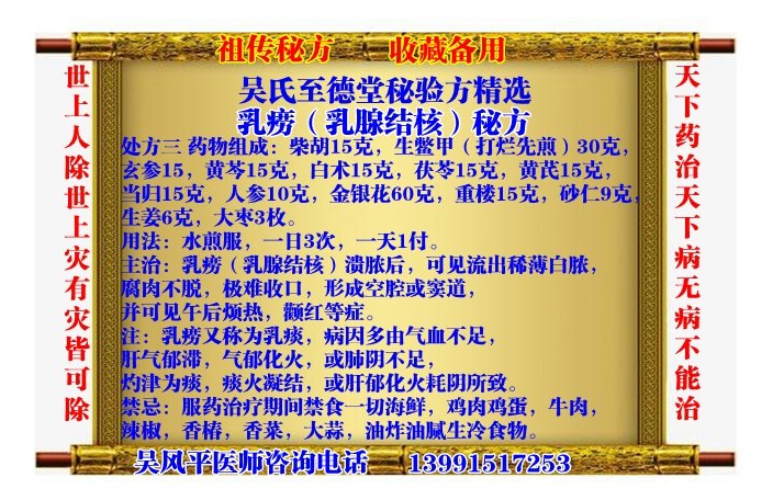主治:乳痨(乳腺结核)成脓期,病变蔓延到乳腺管,可见乳头溢脓或溢血。