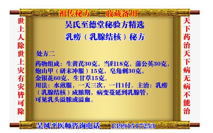 注:乳痨又称为乳痰,病因多由气血不足,肝气郁滞,气郁化火,或肺阴不足,灼津为痰,痰火凝结,或肝郁化火耗阴所致。