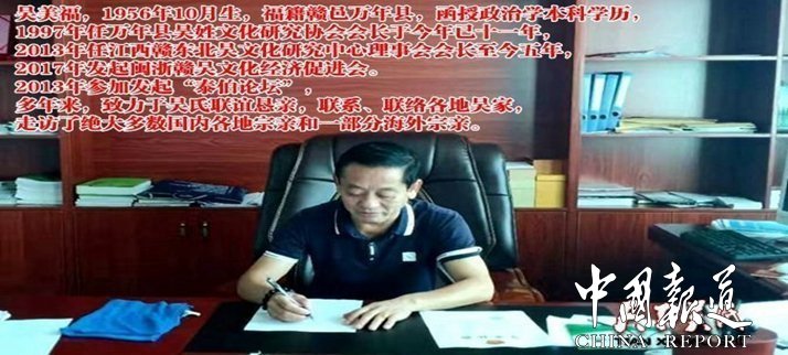 【作者简介】吴美福,男,1956年10月生,福籍赣邑万年县,现定居县城。函授政治学本科学历,1997年任万年县吴姓文化研究协会会长于今年已十一年,2013年任江西赣东北吴文化研究中心理事会会长至今五年,2017年发起闽浙赣吴文化经济促进会。2013年参加发起“泰伯论坛”,多年来,致力于吴氏联谊恳亲,联系、联络各地吴家,走访了绝大多数国内各地宗亲和一部分海外宗亲。