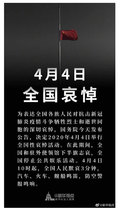 周五(4月3日)中国国务院办公厅在一则通知中指出,为表达全国各族人民对抗击新冠肺炎疫情斗争牺牲烈士和逝世同胞的深切哀悼,国务院决定,2020年4月4日举行全国性哀悼活动。在此期间,全国和驻外使领馆下半旗志哀,全国停止公共娱乐活动。4月4日10时起,全国人民默哀3分钟,汽车、火车、舰船鸣笛,防空警报鸣响。