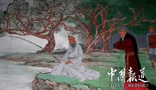 但他不肯贸然拜见,而是设法试探西伯,欲使其前来礼聘。于是便采取欲擒故纵的策略,隐居渭水磻溪,每日直钩垂钓,把鱼钩提离水面三尺以上,而且钩上也不放鱼饵,等待贤君,且作歌曰:“垂钓磻溪乐悠悠,不知冬夏与春秋。那管能钓几条魚,只钓世间君与侯。”这种荒诞(装逼)的举动,果然让姬昌听到后觉得奇怪,便亲临渭水磻溪,走上前充满好奇地问道:“别人垂钓均以诱饵,钩入水中。先生这般钓法,能使鱼上钩吗?”姜子牙见姬昌对人态度谦和,没有一点“西伯”的架子,一看果然是个非凡人物,便进一步试探道:“休道钩离奇,自有负命者。世人皆知纣王无道,可是西伯长子就甘愿上钩。纣王自以为智足以拒谏,言足以饰非,却放跑了有取而代之之心的西伯姬昌。”姬昌闻听此言,大吃一惊。心想:这位老人身居深山,何以能知天下大事?更为不解的是,他怎能把我姬昌的心迹看得如此透彻?肯定不是凡人。便赶紧鞠身施礼,态度诚恳地说道:“愿闻贤士大名?”“在下并非贤士,乃老朽吕尚是也。”“刚才偶听先生所言,真知灼见,字字珠玑,不瞒先生,我就是你说的姬昌。”姜子牙此时才装出一副吃惊的样子,诚惶诚恐地说:“老朽不知,痴言妄想,请西伯恕罪。”姬昌连忙诚恳地说道:“先生何出此言。今纣王无道,天下纷纷,如先生不弃,请您随我出山,兴周灭商,拯救黎民百姓。”随即姬昌同子牙一起乘车回宫,一路上纵论天下大势,口若悬河。姬昌如鱼得水,相见恨晚,回宫之后立即拜姜子牙为“太师”,封其为相,视为心腹。礼聘他为专管军事的“师”,又因吕尚是自己祖父生前日夜想望的人,便又尊称为“太公望”。这便是太公望“姜太公钓鱼愿者上钩”典故的由来。