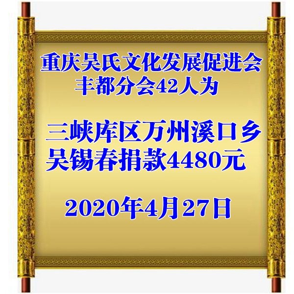 4月27日,重庆吴氏文促会丰都分会积极响应重庆吴氏文化发展促进会的倡议,组织42人为三峡库区万州溪口乡吴锡春捐款4480元。这是2020年第三次参与公益爱心行动。丰都分会会长吴书民表示,丰都吴姓虽然只有6637人,但人心齐,很团结。尊老爱幼,百善孝为先,传承吴氏家风是我们一如继往的美德。我们将继续为更多的人送关怀送温暖。