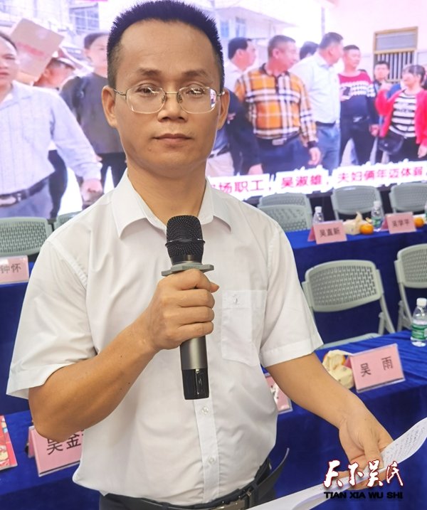 琼海市吴贤秀研究会(吴氏公会)会长吴平先生作大会重要讲话。吴平会长是琼海吴氏宗亲的带路人、贴心人!他的大爱付出精神,有目共睹!几年来,他为吴氏大厦建设、捐资助学、慈善、济困帮扶等等各种爱心奉献款额近百万元。在大会上他勉励琼海吴氏宗亲们,要高举习近平总书记新时代的社会主义伟大旗帜,高举红色娘子军红旗,让我们吴氏泰伯谦让开拓的至德精神在阳江这片永远火热的英雄大地上飘扬!