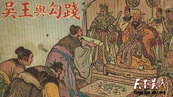 夫差继位为吴国,他任伍子胥为相国,大夫伯魅为太率,加紧操练士兵。过了两年,吴国出动精兵打败了越国,越国损失惨重,只剩下五千人,被吴军包围于会稽山。勾践听从了大臣文种、范蠡的计谋,派文种带很多礼品贿赂吴国的太宰伯嚭,请求让越国当吴国的属国。奸臣伯嚭引文种见了吴王,吴王准备答应了,伍子否表示反对。伯蓄纵恿吴王同意文种的要求,是王不听伍子胥的劝谏,和越国讲和。勾践和范蠡起初留在吳国为吴王服役,后来吴王放他们回国了。