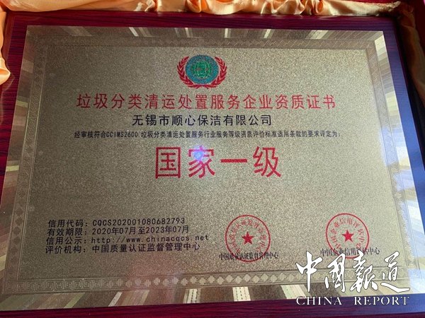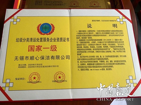 中国报道讯(吴蜀丰通讯员吴建东)吴焕其的无锡市顺心保洁有限公司今年好事接二连三,其一6月连中几个招投标目,其二,在安徽设分公司,其三,日前荣获垃圾分类清运处置服务企业资质"国家一级″证书。这是企业走向全国遍地开花的一张“VIP卡”特别通行证。也是企业近20年来的响当当的金字招牌。