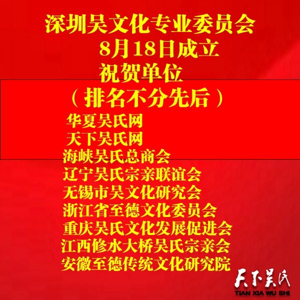欣悉深圳“深吴文化专业委员会”(简称:深吴会)成立庆典暨授牌仪式将于2020年8月18日在深圳市海韵大厦举行,华夏吴氏网特此表示热烈的祝贺!向深吴会各位宗亲表示最美好的祝福并致以最崇高的敬意!