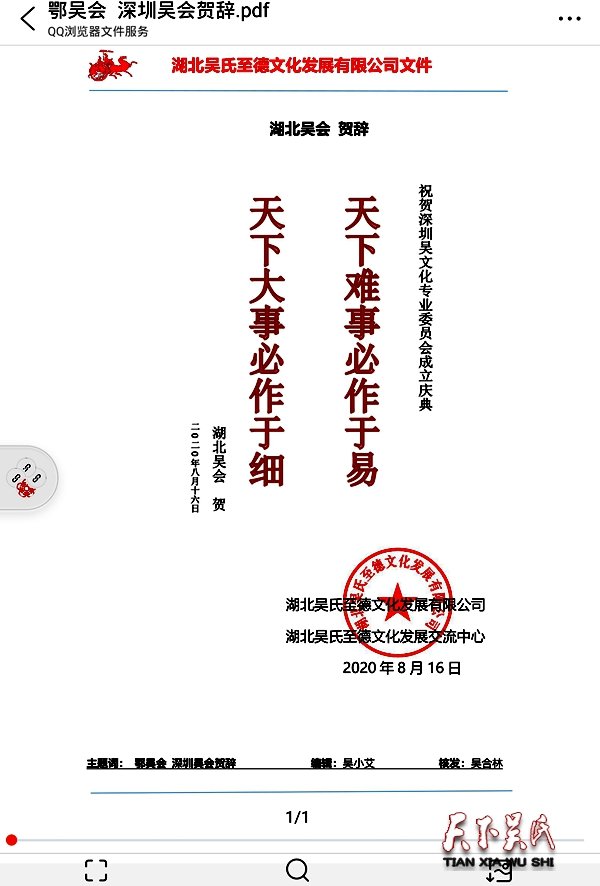欣悉贵会文化专业委员会将不日成立并授牌,可喜可贺。值此盛典之际,我谨代表泰伯吴氏祖地宗亲总会,并以我个人名义,向你们表示最衷心的祝贺和最良好的祝愿。