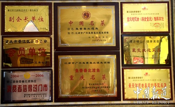 鱼香春北渡鱼先后获得“中国名菜”“诚信企业”“先进商会”“江津区知名商标”“广兴创业致富带头人”“十佳富硒招牌菜”“江津区商会会长单位”“2012年度捐资助学先进单位”“消费者信得过门市”“最受消费者喜爱餐饮名店”重庆电视台“美食重庆推荐单位”“最受欢迎菜品”重庆市綦江旅游协会“会员单位”重庆市卫生局“食品卫生等级A级单位”綦江区工商联(总商会)餐饮“副会长单位”。