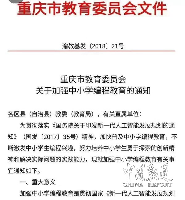2017年教育部、2018年重庆市教委发红头文件明确要求:小学必修36课时,初中必修36课时;2019年全国校长大会受邀参加研讨,2020年教育部发文,明确规定从9月开始,全国大中小学必修3门课程,分别是书法、编程、劳动教育;机器人.少儿编程已是国家发展大趋势;
