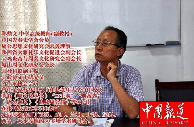 【作者简介】郑鼎文,大学文化,中学高级教师(副教授),中国先秦史学会会员,周公思想文化研究会常务理事,陕西省大雅礼乐文化促进会副会长,宝鸡炎帝与周秦文化研究会副会长,岐山周文化研究会会长,县社科联副主席,县政协文史研究员,省作家协会会员,曾任范家营高中校长和县老年大学首任校长,著有《周文化丛书》“三王卷”“典故卷”、《周公演义》《品味周公庙》等9本书,在报刊发表文章500多篇。先后应邀参加了武汉、成都、兰州、上海、宝鸡、西安、天水等地的30多场学术研讨会。