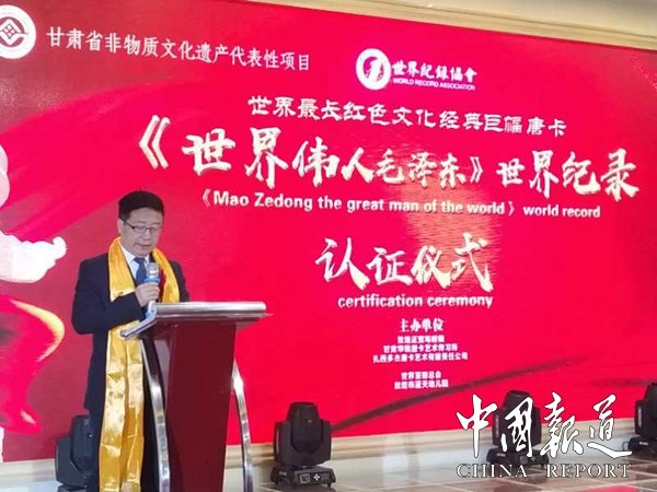 大会伊始,徐悲鸿再传弟子、国务院外交部国礼画家吴进良大师,向他的弟子扎西多杰特意发来了祝贺视频。在敦煌正觉写经院院长王淑萍女士致开幕词后,世界记录协会高级认证官张健先生宣读了扎西多杰老师主创的文化巨幅唐卡长卷《世界伟人毛泽东》世界记录认证词,并颁发了世界记录证书,由此,一项新的世界记录诞生,这是敦煌人民的骄傲,这是中国人民的骄傲,也是世界人民的骄傲。